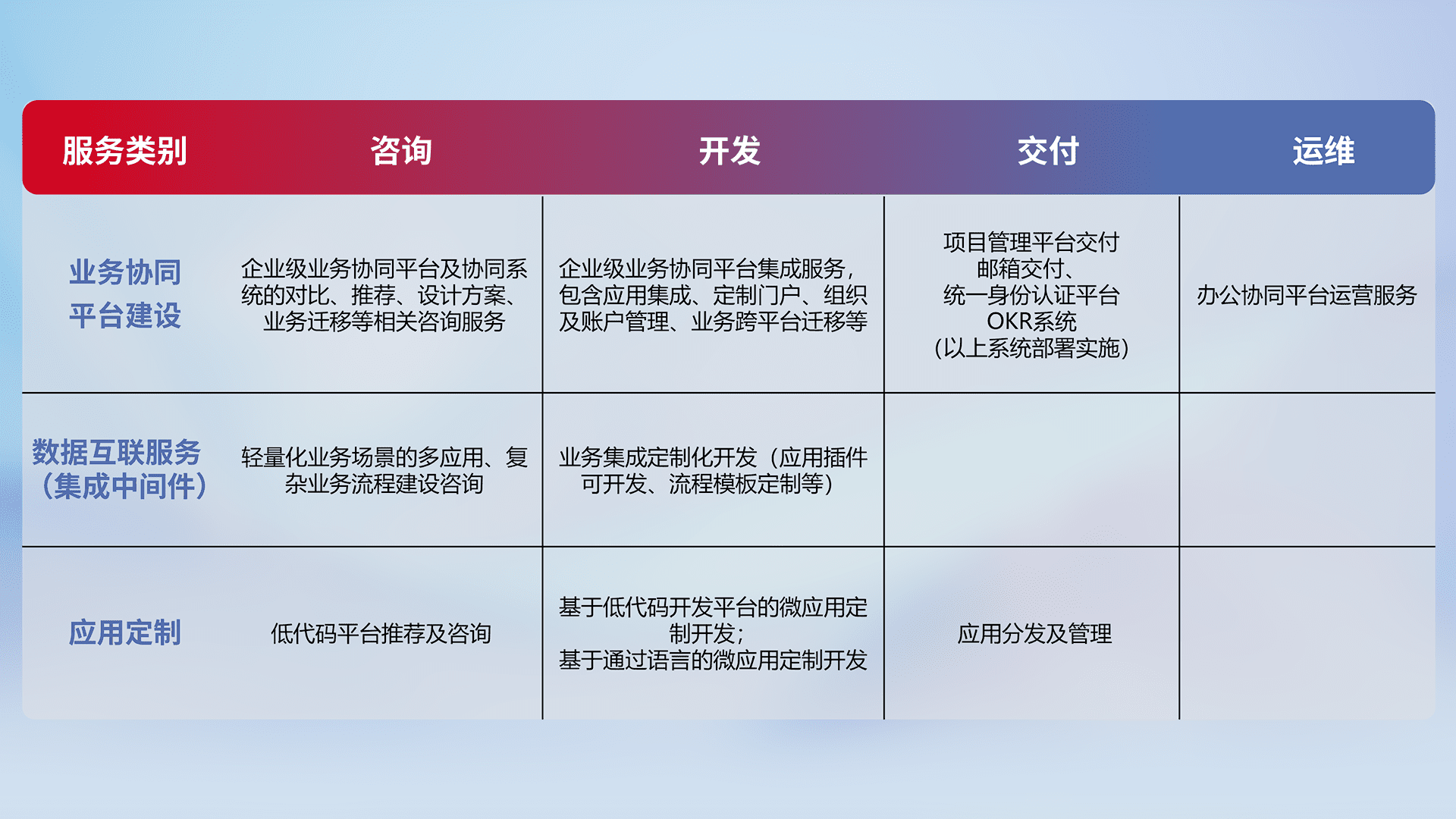 针对钉钉、、、、企微、、、IDaas等平台级产品提供产品的规划、、、、方案、、、交付、、、定制化开发等服务,,,实现如统一协同办公、、、智能客户服务、、、混合会议管理、、智能数据查询、、、、等业务场景,,实现数字化转型。。